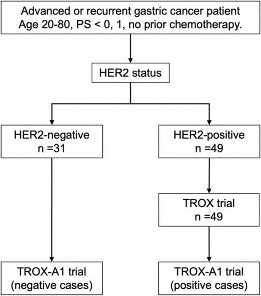 傳統(tǒng)意義上胃癌是指原發(fā)于胃的上皮源性惡性腫瘤。根據(jù)2022年匯總數(shù)據(jù),胃癌是全球發(fā)病率和死亡率第五的常見惡性腫瘤,發(fā)病率約為97萬/每年、死亡約為66萬/年[1]。人表皮生長因子受體2(HER2)是胃癌常見的重要靶點,大約12%-18%的胃癌患者會出現(xiàn)HER2過表達或基因擴增[2.3]。HER2陽性晚期胃癌一線治療中,曲妥珠單抗是抗HER2靶向治療的基石,對于PD-L1 CPS≥1患者,也可采取PD-1單抗+曲妥珠單抗+化療的聯(lián)合方案[4]。為了更深入地了解HER2陽性和陰性胃癌患者之間的基因特征差異,研究人員對TROX-A1試驗中80例HER2陽性和陰性胃癌患者的基因特征進行了深入分析,旨在探究HER2陽性和陰性胃癌患者可能影響腫瘤進展和治療反應(yīng)的基因特征,從而為胃癌的個性化治療提供新的思路和方法。