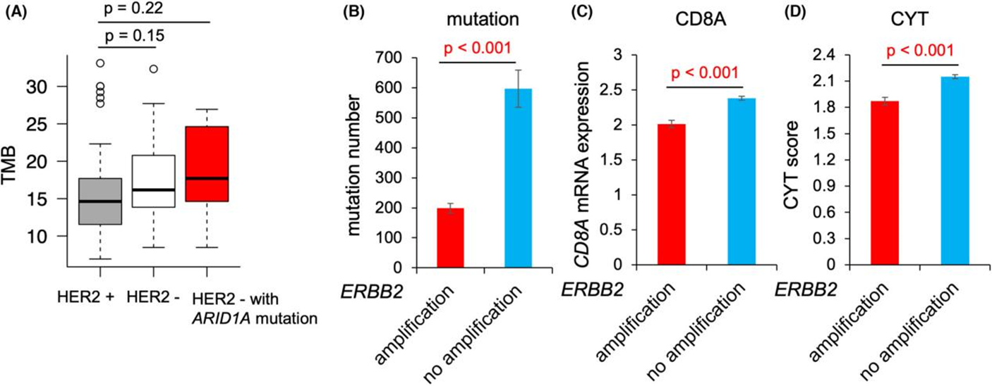 HER2陽性患者、HER2陰性患者和HER2陰性患者的TMB中值A(chǔ)RID1A突變分別為14.6、16.2和17.7。HER2陽性患者的TMB中值A(chǔ)RID1A突變率為16.2。在HER2陰性的胃癌患者中有較高TMB的趨勢,特別是在ARID1A突變患者中。